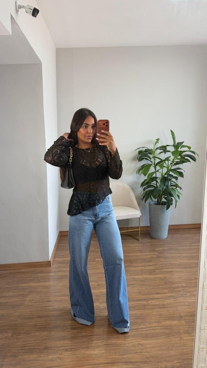 Blusa de renda preta com modelagem assimetrica, valorizando a delicadeza e a transparência do tecido 🤍✨