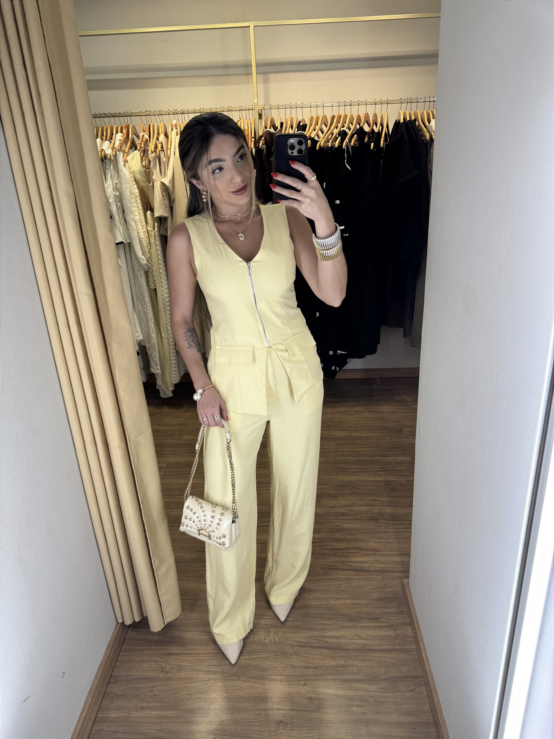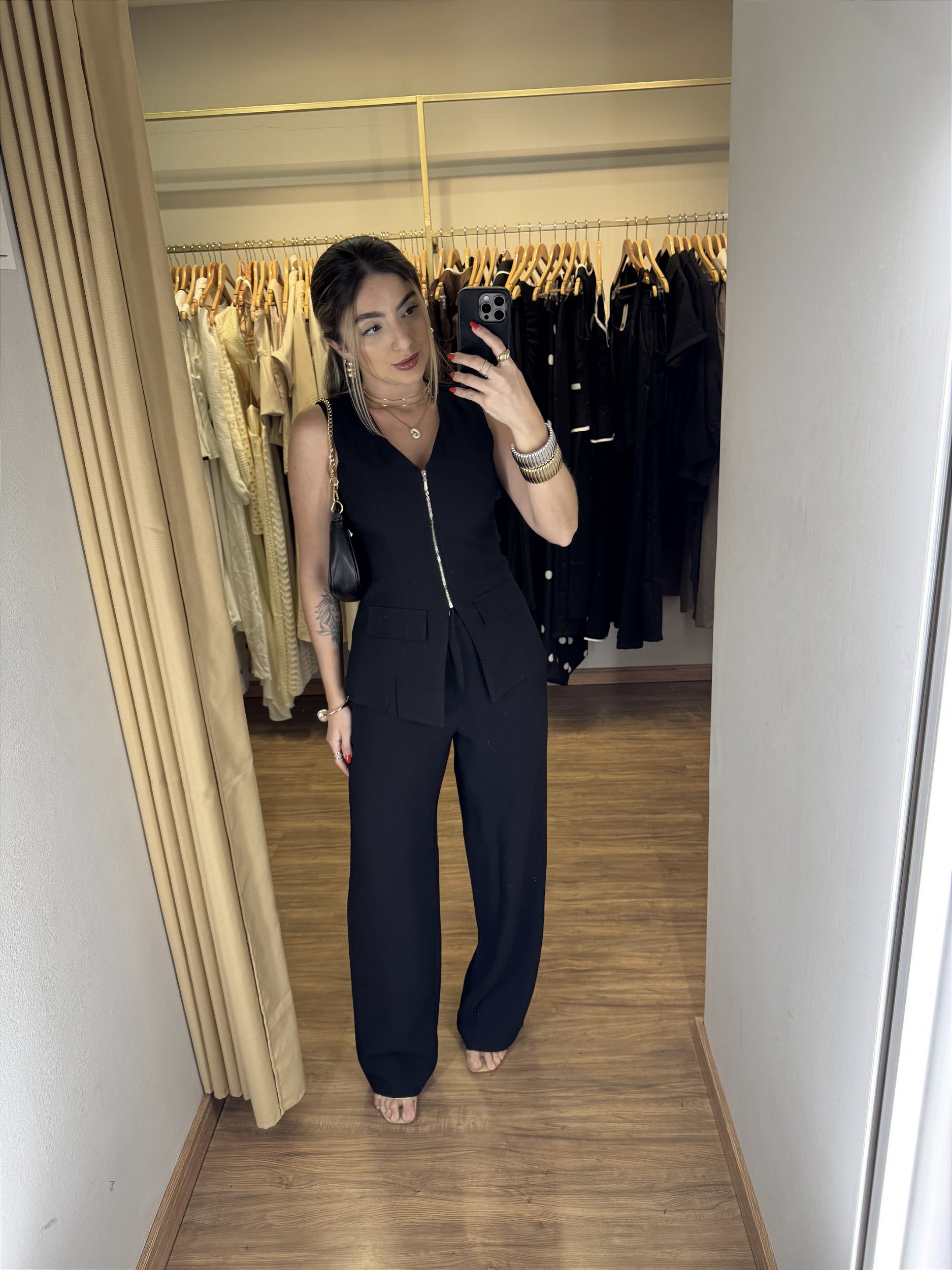 Descrição: Conjunto composto por calça e blusa todo em alfaiataria premium. A calça é pantalona, possui passador para cinto, bolso faca, ziper. Traz um caimento impecável e muita elegância. A blusa possui forro duplo no busto, ziper frontal, bolso fake nas laterais. É um conjunto bem versátil e você consegue usar em qualquer ocasião.