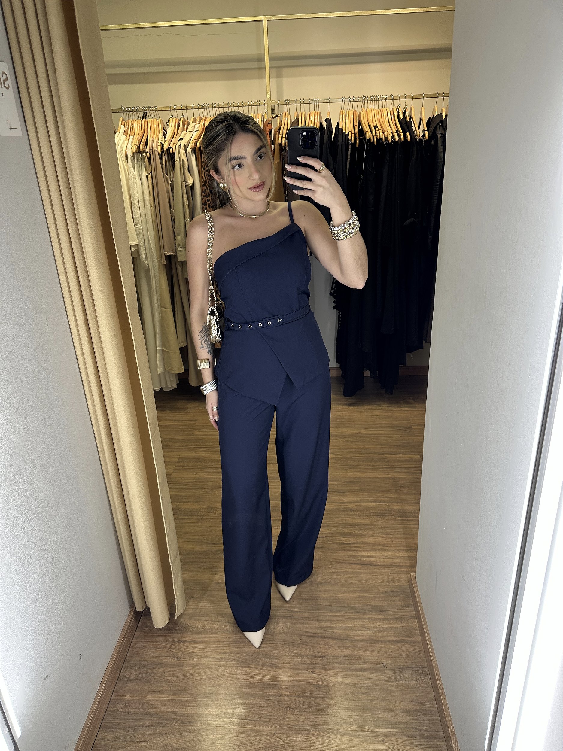 Conjunto composto por blusa e calça pantalona todo em Alfaiataria. A calça possui bolso faca, botão forrado e passador para cinto. A blusa é um ombro só possui regulagem na alça, bojo no busto, detalhe assimétrico, passaor para cinto, elastico nas costas, ziper e é composto por um cinto.