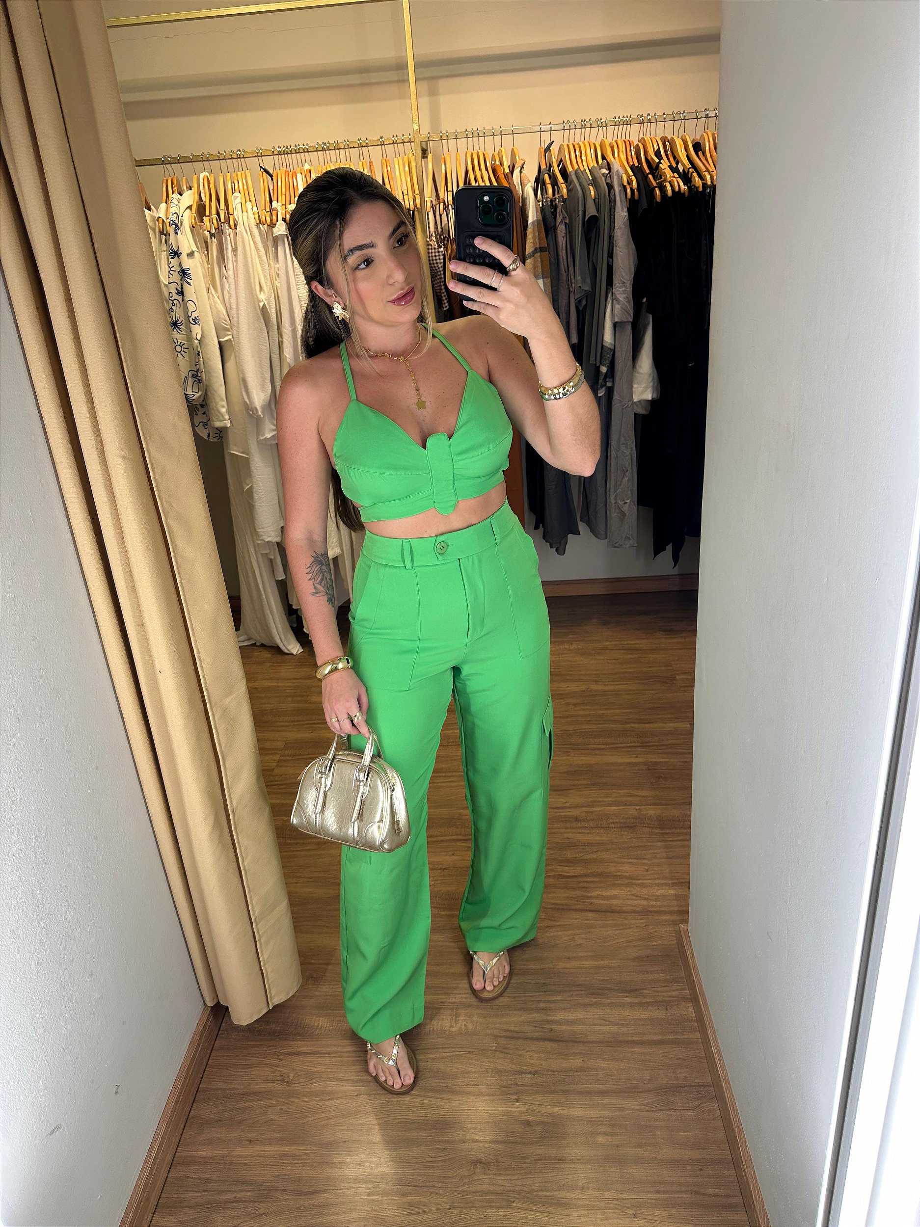 Conjunto composto por cropped e calça cargo todo em Alfaiataria. A calça possui bolso faca, bolso na lateral e passador para cinto. o cropped possui amarraçães nas costas, recorlte na lateral,forro duplo no busto e não possui bojo.
