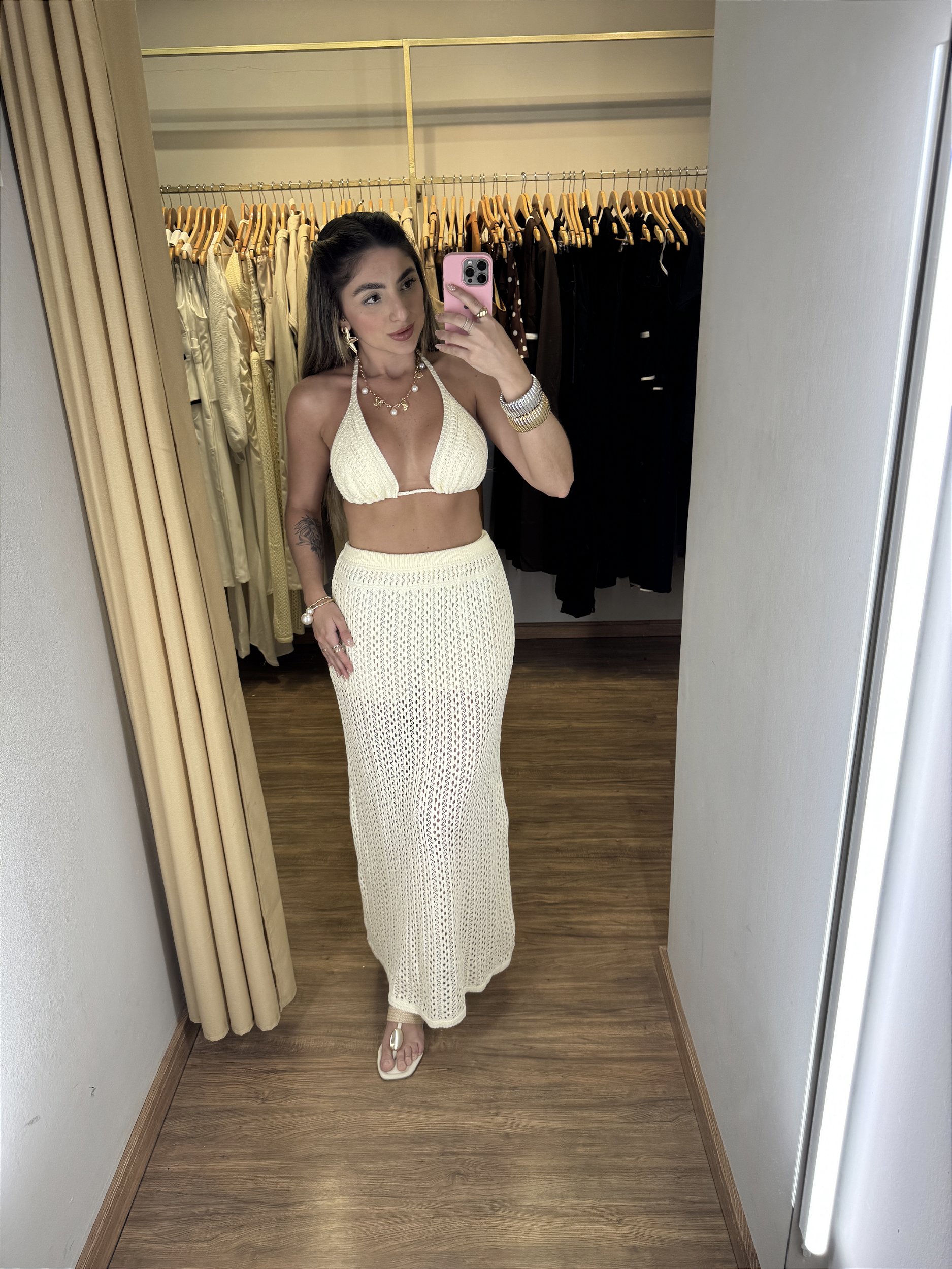 Descrição: Conjunto composto por saia, cropped e shortinho. Todo em trico premium, possui detalhe em todo ele, vem acompanhado de um shortinho e o cropped possui amarração nas costas e no pescoço