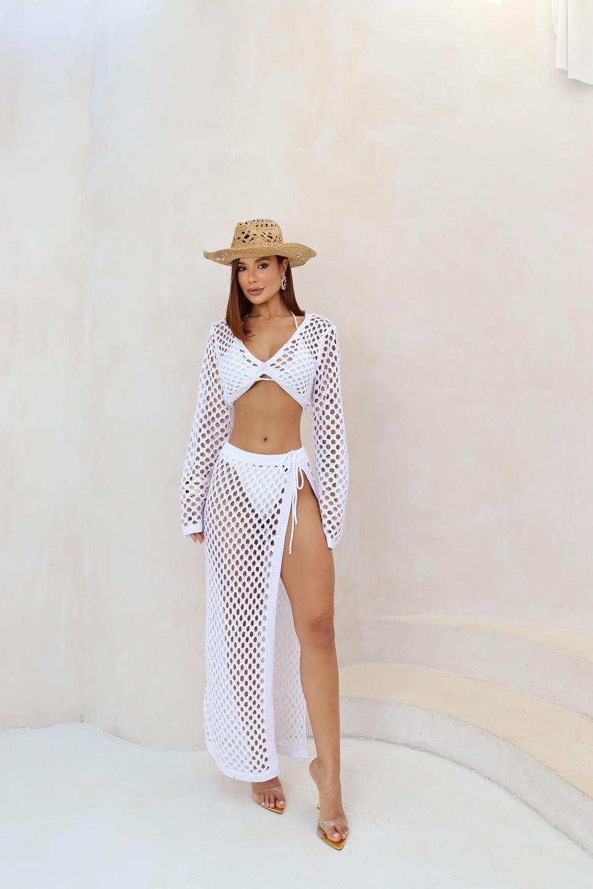 Descrição: Conjunto/saída de praia todo em tricô premium. Conjunto composto por saia e cropped. Nossa saia possui uma fenda na lateral, com amarração na lateral possui recorte na cintura e fenda frontal