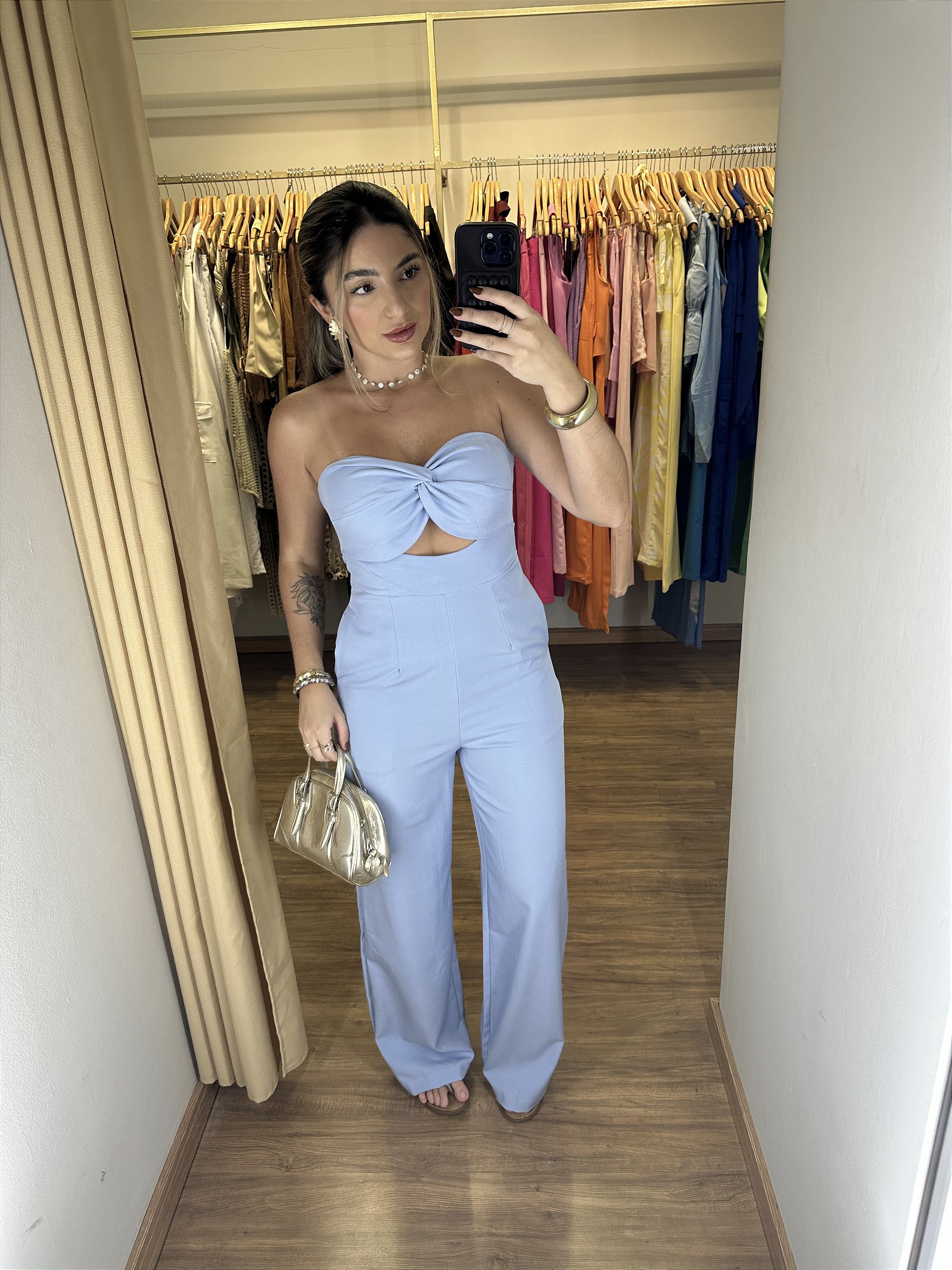 Macacão pantalona todo em alfaiataria, possui zíper, amarração nas costas, tecido duplo no busto e detalhe no busto em nó.
