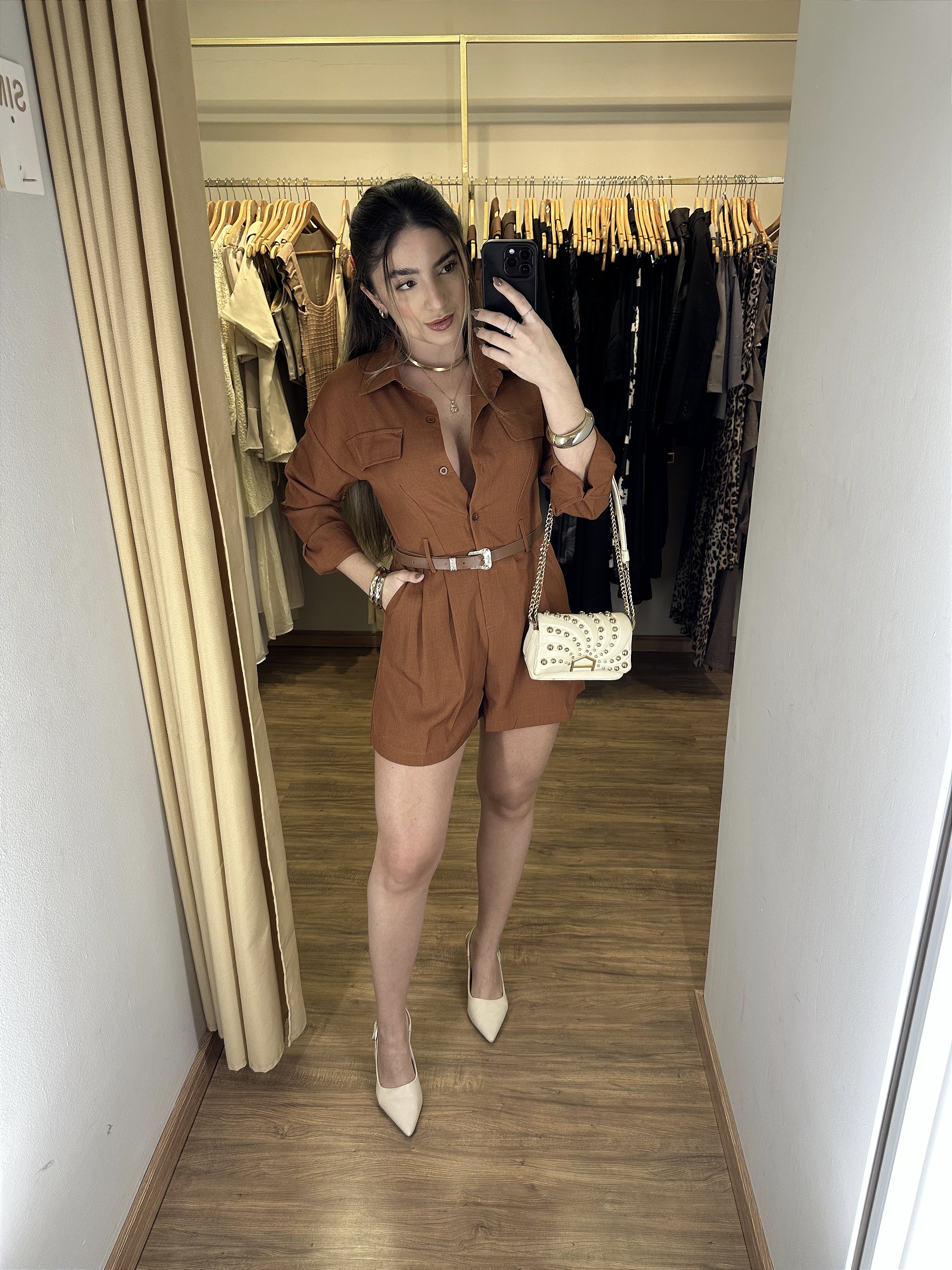 Macaquinho manga longa todo em alfaiataria Marrant. Ele possui bolso fake na parte da frete do macaquinho e bolso faca nas laterais, possui botões nas mangas e mais quatro botões na frente, passador para cinto e com detalhe na frente. E é composto por um cinto.