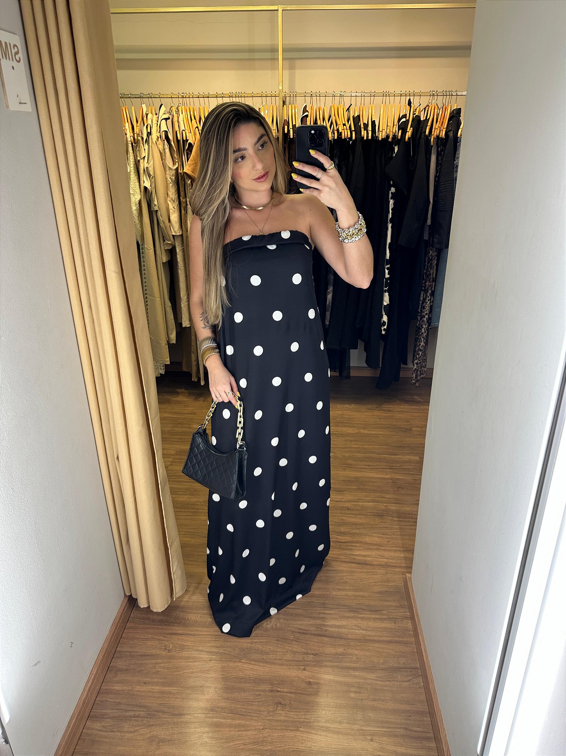 Vestido Tomara que Caia todo em crepe com toques de seda. O vestido é todo em póa, possui um leve decote nas costas, elastico na parte de cima, todo forradinho e dá uma ótima sustentanção. Ele é leve, bem atemporal e tem a sofisticação na medida certa, com um acabamento impecavel e perfeito para se usar nesse verão.
